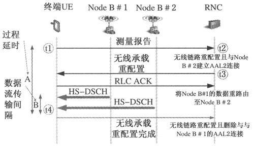 對(duì)于下面的延時(shí)分析,我們假設(shè)信令無(wú)線承載(SRB)在下行映射到HS-DSCH信道上,在上行映射到增強(qiáng)上行鏈路專用信道(E-DCH)上,且TTI均為10ms。HS-DSCH是HSDPA的傳輸信道,E-DCH是HSUPA的傳輸信道。首先,當(dāng)滿足測(cè)量觸發(fā)事件1d(最優(yōu)小區(qū)改變)時(shí),UE在信令無(wú)線承載上發(fā)送測(cè)量報(bào)告。傳輸從t1開始,RNC在t2時(shí)刻接收到消息。服務(wù)RNC將為目標(biāo)NodeB保留基站資源和Iub資源。該資源的預(yù)留通過(guò)使用預(yù)配置可以完成得非?。一旦資源在t3時(shí)刻準(zhǔn)備好,RNC將向UE發(fā)送無(wú)線承載重配置消息,此時(shí)UE還是從源NodeB中接收數(shù)據(jù)。當(dāng)UE對(duì)重配置消息進(jìn)行解碼,并且在有效時(shí)刻t4到期前,UE接收數(shù)據(jù)將從源小區(qū)切換到目標(biāo)小區(qū)。UE開始監(jiān)聽目標(biāo)小區(qū)的高速共享控制信道(HS-SCCH),HS-SCCH是HSDPA下行的共享控制信道。UE也會(huì)測(cè)量目標(biāo)小區(qū)的信道質(zhì)量,并發(fā)送目標(biāo)小區(qū)的CQI報(bào)告。源小區(qū)該用戶的MAC-hs在小區(qū)切換后將重置,并將緩存的協(xié)議數(shù)據(jù)單元(PDU)刪除。同時(shí)目標(biāo)小區(qū)MAC-hs中的流控單元開始從服務(wù)RNC中請(qǐng)求PDU,這樣便可以通過(guò)HS-DSCH向用戶發(fā)送數(shù)據(jù)。在小區(qū)切換過(guò)程中,RNC可以同時(shí)向兩個(gè)Node