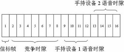 根據(jù)設(shè)計的特點,無線語音網(wǎng)關(guān)同手持設(shè)備間的無線網(wǎng)絡采用星型拓撲結(jié)構(gòu),無線語音網(wǎng)關(guān)作為無線個域網(wǎng)的協(xié)調(diào)器同手持設(shè)備進行信息交互。IEEE802.15.4MAC層分為使用信標幀和不使用信標幀兩種工作模式,本設(shè)計采用使用信標幀同步的超幀結(jié)構(gòu),由無線語音網(wǎng)關(guān)發(fā)送信標幀同步無線手持設(shè)備的數(shù)據(jù)傳輸。本設(shè)計中超幀長30ms,等分為16個時隙,每個時隙為1.875ms。信標幀在時隙1發(fā)送,時隙2到時隙8為競爭時隙,使用時隙CSMA-CA算法傳輸命令幀和應答幀。時隙9到時隙16固定分配給兩個手持設(shè)備作為上下行語音數(shù)據(jù)通道。上下行各兩個時隙的分配可以滿足經(jīng)