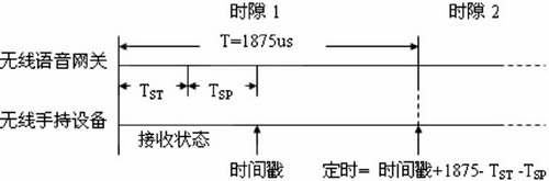 時隙1開始后,語音網(wǎng)關(guān)需要TSTms的時間將射頻芯片從空閑狀態(tài)轉(zhuǎn)換為發(fā)送狀態(tài),當轉(zhuǎn)換為發(fā)送狀態(tài)后,預先存儲在射頻芯片發(fā)送RAM中的信標幀立即開始發(fā)送,手持設(shè)備上的射頻芯片在收到六個字節(jié)TSPms后自動鎖存一個當前時間timestamp(時間戳),