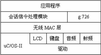 操作系統(tǒng)之上是無線MAC層,該模塊針對語音無線傳輸?shù)奶攸c簡化實現(xiàn)了IEEE 802.15.4 協(xié)議MAC層功能。第三層為語音壓縮編解碼g.726模塊和無線網(wǎng)內(nèi)部會話信令處理模塊。會話信令處理模塊負責處理來自無線語音網(wǎng)關(guān)的會話信令。最上層為應用層,實現(xiàn)用戶界面和通話過程控制。無線手持設(shè)備總統(tǒng)框架如圖6所示。