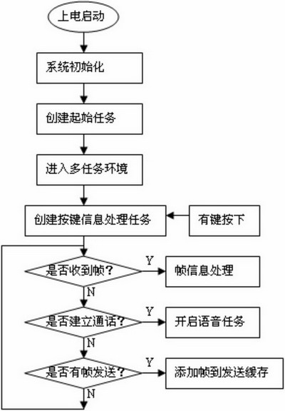 當手持設(shè)備上電啟動后,其工作流程如圖7示。首先進行的是系統(tǒng)的初始化,包括處理器初始化,操作系統(tǒng)mC/OS-II初始化,LCD,鍵盤,射頻模塊等的初始化。之后建立起始任務并通過OSStart()函數(shù)進入多任務環(huán)境。此時起始任務占用CPU資源,在起始任務中,建立按鍵信息處理任務并通過信號量機制掛起。然后判斷是否收到來自無線語音網(wǎng)關(guān)的幀,如果有,調(diào)用frame_deal()函數(shù)處理幀信息,在該函數(shù)中調(diào)用call_command_deal()完成無線網(wǎng)內(nèi)部會話信令的處理。接著判斷通話是否建立,如果建立則創(chuàng)建語音任務,在語音進程中使能PCM編解碼芯片,并進行g(shù).726壓縮編碼。最后判斷是否有幀需要發(fā)送給無線語音網(wǎng)關(guān),如果有則把幀添加到發(fā)送緩存,等待發(fā)送時隙到來。這一過程完成以后重新跳到判斷是否收到來自無線語音網(wǎng)關(guān)的幀,重復以上過程。如果有鍵盤中斷,將會釋放一個信號量,該信號量將解掛按鍵信息處理任務。該任務對鍵盤輸入信息進行處理。