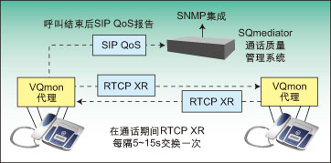 圖2顯示了如何在IP網(wǎng)絡(luò)上使用行業(yè)標(biāo)準(zhǔn)覆蓋質(zhì)量管理系統(tǒng)。圖中顯示了嵌入式軟件探測裝置,如IP話機中的行業(yè)標(biāo)準(zhǔn)VQMon代理,它們可實時監(jiān)測通話質(zhì)量。這些代理可生成RTCP