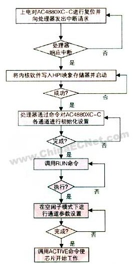 主要是基于嵌入式arm處理器,通過hpi接口實現(xiàn)對ac4880xc-c及相關(guān)芯片的讀寫操作。流程圖如圖5所示: