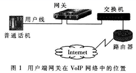 近年來隨著寬帶網(wǎng)絡和IP技術的日益發(fā)展,VoIP>(Volee over Internet Protoc01)技術的應用越來越廣泛。網(wǎng)關是VoIP網(wǎng)絡中的重要設備,按照應用領域可分為電信級網(wǎng)關和用戶端網(wǎng)關。用戶端網(wǎng)關設備主要應用于小區(qū)和企業(yè),是連接終端電話和IP網(wǎng)絡的橋梁,主要功能是進行語音編解碼、信令處理、VoIP協(xié)議處理和路由協(xié)議處理等。用戶端網(wǎng)關設備在VoIP網(wǎng)絡中的位置如圖1所示?梢钥闯觯W(wǎng)關處于用戶電話線路部分的末端、IP網(wǎng)絡部分的起始端。