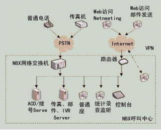 NBX呼叫中心是基于3Com公司NBX網(wǎng)絡(luò)電話交換機(jī)平臺構(gòu)筑的、語音數(shù)據(jù)合一的呼叫中心。系統(tǒng)配置拓?fù)浣Y(jié)構(gòu)如圖3所示。