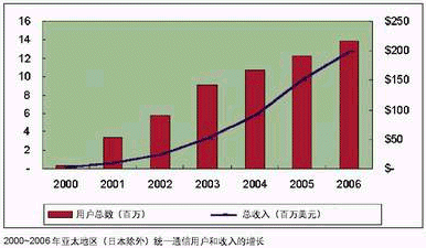 據(jù)IDC預(yù)測,亞太地區(qū)(不包括日本)統(tǒng)一通信用戶數(shù)量將從2000年的32萬增長到2006年的1385萬。盡管起點較低,收入將從2000年的119萬美元增長到2006年的1.987億美元。這個增長大部分受中國和澳大利亞推動,在這兩個國家,價格和市場由上層大電信公司決定。