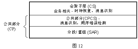 ATM適配層,是ATM核心(包括ATM層和物理層,與業(yè)務無關)和高層間的接口(見圖5),它是為使ATM層能適應不同業(yè)務類型而設置的,故ATM對各種業(yè)務承載能力集中體現(xiàn)在ATM適配層。ATM適配層又細分為若干子層。具體如下圖12。