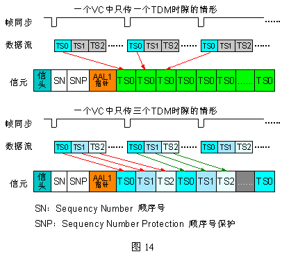 在同一個虛通道(VC)中,AAL1還支持一個或多個DS0(64Kbps)。當虛通道中只有一個DS0話音時,可以使用無結(jié)構數(shù)據(jù)格式(UDF:Unstructured Data Format)傳送,這是一種面向比特的技術;當有多個DS0同時傳送時,必須使用結(jié)構化數(shù)據(jù)格式(SDF:Structured Data Format),此時各DS0數(shù)據(jù)流按字節(jié)依次傳送,即是面向字節(jié)的。這兩種格式的區(qū)別如下圖13所示。其中AAL1指針用于指示多DS0時,第一個DS0字節(jié)位置,以便定時。利用AAL1可以實現(xiàn)ATM對STM(TDM)信號的傳送,見圖14。
