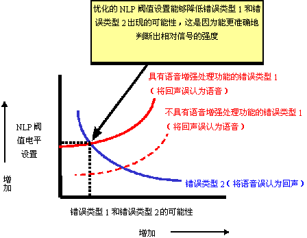 dB)能夠顯著降低將雙對(duì)話語(yǔ)音信號(hào)誤認(rèn)為聲學(xué)回聲信號(hào)的概率,從而防止了"錯(cuò)誤類型2"?傊"錯(cuò)誤類型1"(實(shí)線曲線,具有語(yǔ)音增強(qiáng)特性)和"錯(cuò)誤類型2"曲線的交叉點(diǎn)上,通過(guò)與之對(duì)應(yīng)的NLP設(shè)置,可以獲得最佳的性能(請(qǐng)參見(jiàn)圖10)。