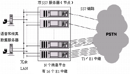 圖6所示為一個運營級的聲訊平臺,這是個面向公眾的開放結(jié)構(gòu)增強業(yè)務(wù)平臺。系統(tǒng)由多臺計算機(或叫節(jié)點)組成,節(jié)點間通過以太網(wǎng)相連接以提供冗余功能,這是一個很規(guī)范、具有很高可靠性的系統(tǒng)。在這一例子中,兩個SS7節(jié)點用于為應用提供信令,而其它幾個媒體節(jié)點用于提供和PSTN間的通道連接和呼叫處理功能,包括所有和用戶的音頻或聲音對話,以及信息播放。每個媒體節(jié)點一般使用有一定數(shù)量的線路和DSP資源的板卡,比如NMS