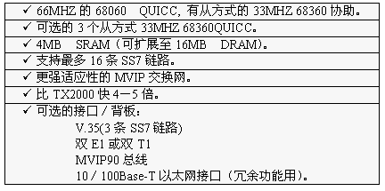 TX3000卡的功能大致和TX2000卡相同,但它比TX2000的性能2.5至5倍。TX3000卡上有一個(gè)66MHZ的68060協(xié)處理器。TX3000卡為SS7應(yīng)用配置1至4個(gè)QUICC通信控制器,最多16條信令鏈路,提供一個(gè)三口V.35,擁有雙T1或雙E1接口。(主板上標(biāo)準(zhǔn)配置一個(gè)QUICC,支持四條SS7鏈路,當(dāng)CT總線和串行接口都要使用,或者處理的鏈路超過4條時(shí),可先配置有三個(gè)QUICC的背板,四個(gè)QUICC可支持16條SS7鏈路)。