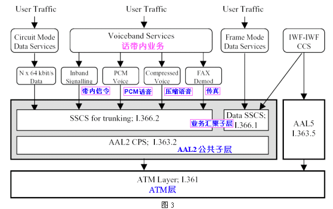 話帶業(yè)務包括標準PCM、壓縮語音和FAX等。它們在ATM網(wǎng)絡的傳輸主要有兩種方式:LES和VoIP/AAL5/ATM。