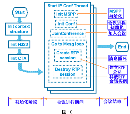 整個(gè)IP會議大概過程可以用圖10來說明,各子流程均由MGCP/H.323的相關(guān)API函數(shù)完成。