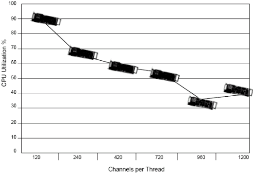 圖 3 顯示了運(yùn)行的線程數(shù)和不同的CPU使用率. 當(dāng)有多個(gè)一個(gè)線程運(yùn)行的時(shí)候, 每個(gè)線程處理一定的負(fù)荷. 例如, 如果有兩個(gè)線程運(yùn)行, 每個(gè)處理600個(gè)同時(shí)的放音.