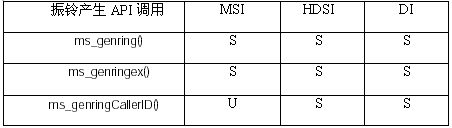 為主叫ID提供頻移鍵控(FSK)能力,HDSI和DI座席支持ms_genringCallerID() API調(diào)用,也支持基礎的和擴展的MSI振鈴產(chǎn)生函數(shù)調(diào)用。表2列出了每一座席產(chǎn)品支持的產(chǎn)生振鈴的API函數(shù),支持的API調(diào)用以"S"表示,不支持的調(diào)用用"U"表示。
