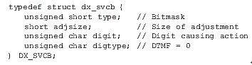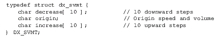 速度/音量調(diào)節(jié)表(DX_SVMT)數(shù)據(jù)結(jié)構(gòu)有21個代表不同級別的速度和音量的條目,用于指定信道的速度或者音量調(diào)節(jié)的變化率。這些值可以設置或者用dx_setsvmt()和dx_getsvmt()從表中取值。
