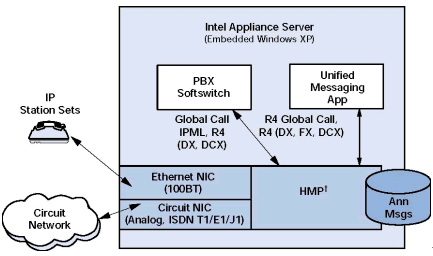 PBX 應用可以被實施在一個低成本的Dialogic應用設(shè)備或一個使用Dialogic處理器的普通臺式計算機上. 最終用戶可以根據(jù)需要選擇平臺.