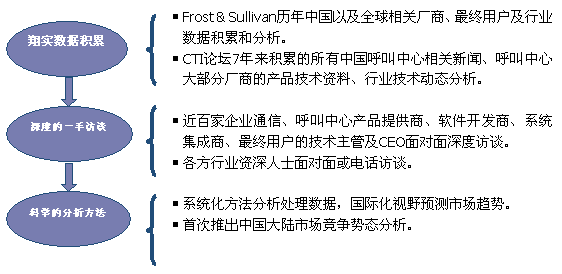 Frost & Sullivan 和 CTI論壇(www.camillecerf.net)共同組成的調(diào)研小組,在查閱了大量資料的基礎(chǔ)之上,以企業(yè)通信及呼叫中心的設(shè)備應(yīng)用、投資計(jì)劃以及相關(guān)廠商的市場表現(xiàn)為出發(fā)點(diǎn),通過對企業(yè)通信及呼叫中心重要應(yīng)用企業(yè)、在市場占主導(dǎo)地位的二十多家設(shè)備廠商、二十多家軟件開發(fā)商、十幾家系統(tǒng)集成商、數(shù)家外包運(yùn)營商的深度訪談,參閱內(nèi)部相關(guān)報(bào)告及數(shù)據(jù)庫,對數(shù)據(jù)的來源和數(shù)據(jù)的準(zhǔn)確性進(jìn)行了詳細(xì)核對與論證;憑借參與調(diào)研人員的多年從業(yè)經(jīng)